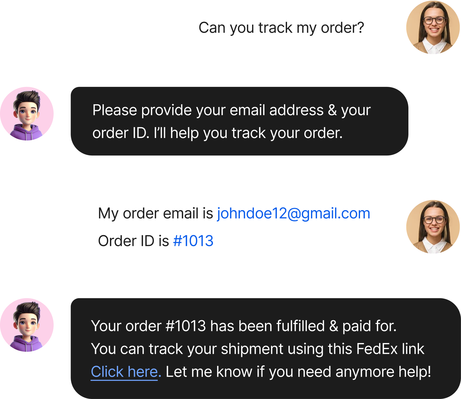 Answers questions about order status, tracking, and returns instantly. Customers get fast, accurate responses without waiting on hold.