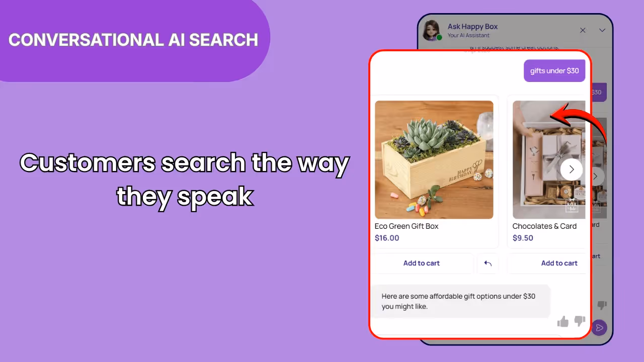 Instead of relying on basic search, your customers can now type in their natural language to find the products they need and get instant results.