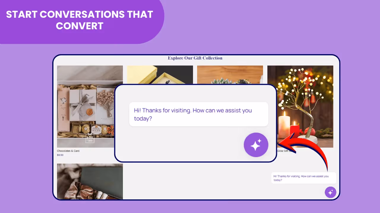 You can give engaging prompts that encourage your customers to chat. You can place different nudges on the Homepage, Product pages, and Cart page to reduce drop-offs.